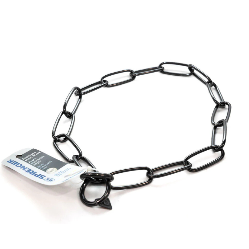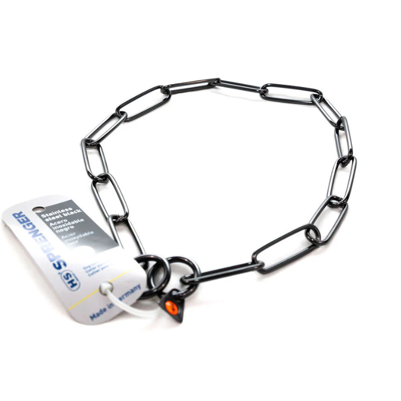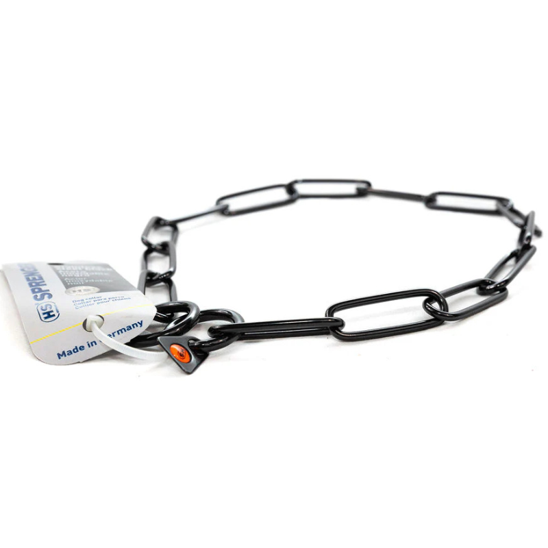 Collar Herm Sprenger Fur Saver de 61cm en acero inoxidable negro con eslabones largos, ideal para perros de pelaje largo y adiestramiento profesional.