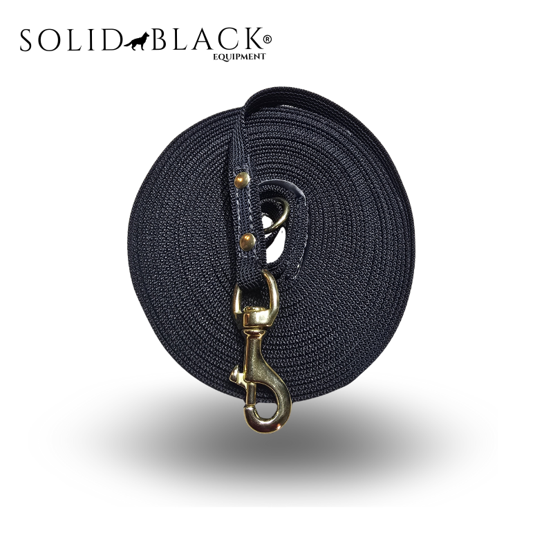 Trailla profesional de 10 mts x 1.5 cm en cinta engomada antideslizante, cocida y remachada, con mosquetón de bronce. Ideal para rastro, búsqueda y trabajos deportivos. Fabricación Solid Black con materiales importados.